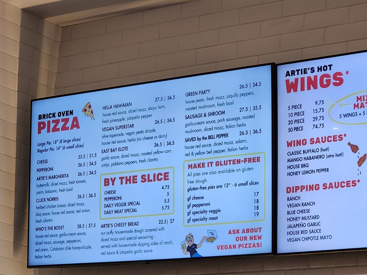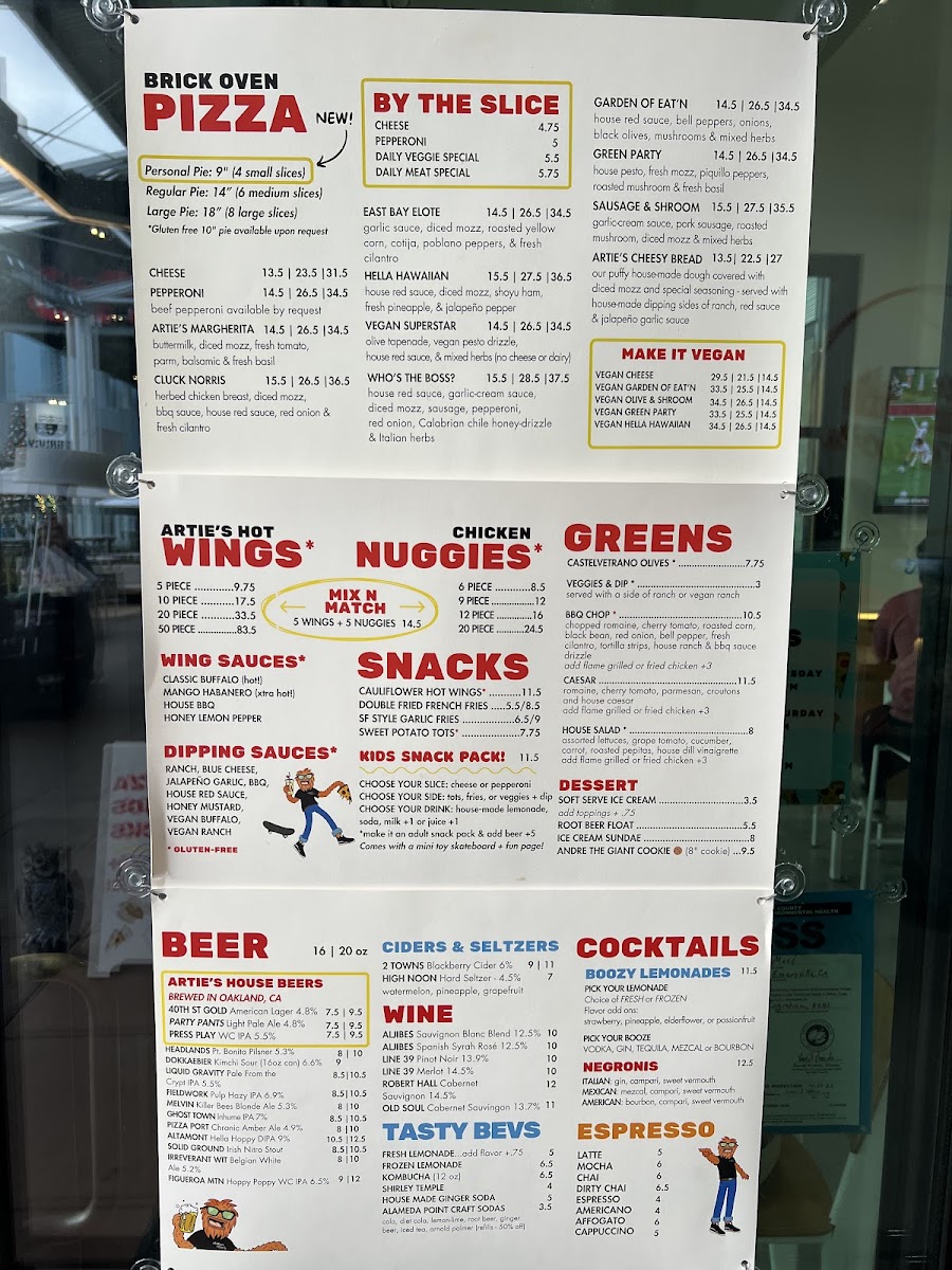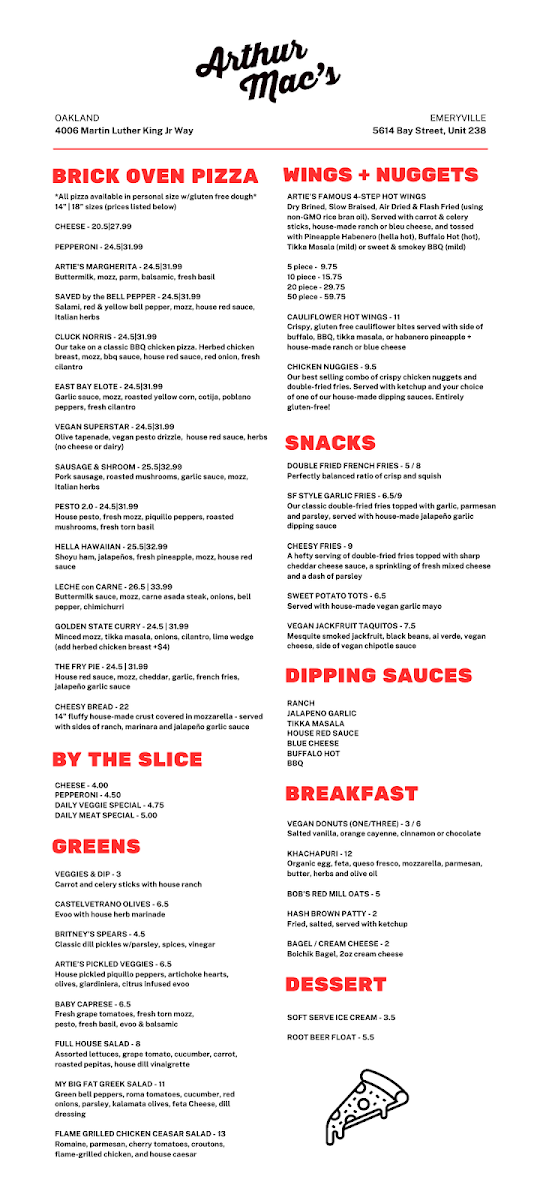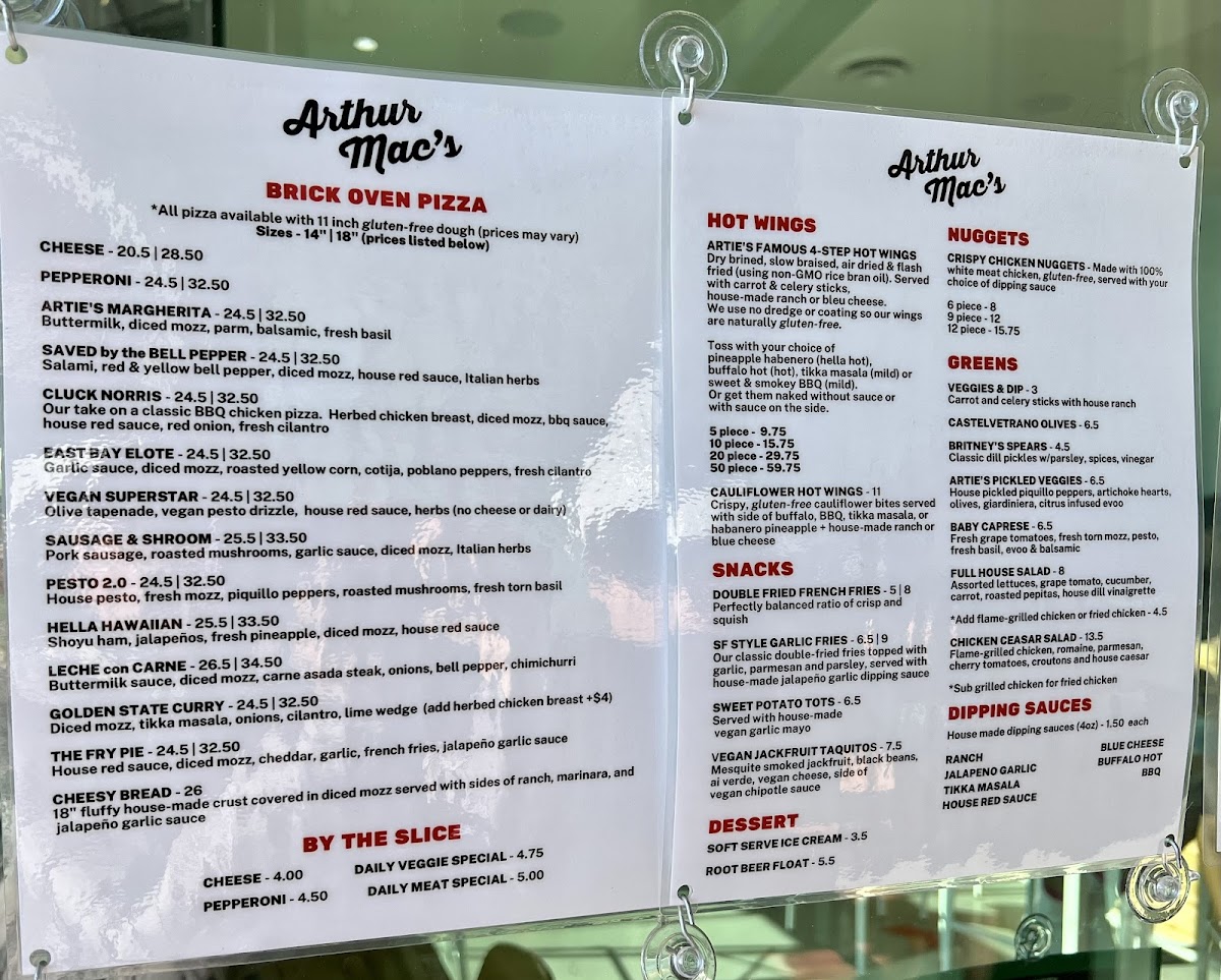 From a reviewer’s perspective, the menu at Arthur Mac's Little Snack feels like a confident wrap-up of everything the brand does best: playful pizza culture, serious vegan creativity, and snackable comfort food that works for groups or quick bites alike. The Daily Slice Specials-from Cheese Slice and Pepperoni Slice to rotating options like Who’s The Boss, East Bay Elote, and Three’s Company-set a casual, grab-and-go tone. That flexibility carries into the pizza lineup, where gluten-free and vegan diners are clearly prioritized with options such as Gluten Free Vegan Pepperoni Pizza, Gluten Free Vegan Cheese Pizza, Gluten Free Vegan Garden Of Eat’n, Gluten Free Vegan Hella Hawaiian Pizza, and Gluten Free Vegan Green Party Pizza. Across sizes, the menu stays consistent and generous: Personal Vegan Cheese Pizza, Personal Vegan Garden Of Eat’n, Personal Vegan Pepperoni Pizza, and Personal Vegan Hella Hawaiian Pizza are perfect for solo diners, while Medium Vegan Pepperoni Pizza, Medium Vegan Green Party Pizza, Medium Garden Of Eat’n, Large Vegan Cheese Pizza, Large Vegan Garden Of Eat’n, and Large Vegan Hella Hawaiian Pizza are clearly designed for sharing. Signature pies like Large Artie’s Margherita Pizza, Large Green Party Pizza, and Large Specialty Half & Half 18" add variety without overcomplicating the experience.