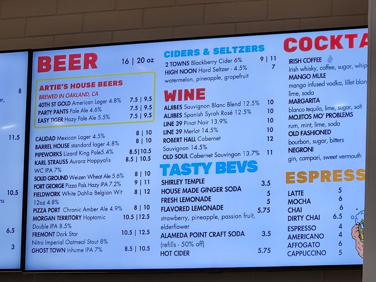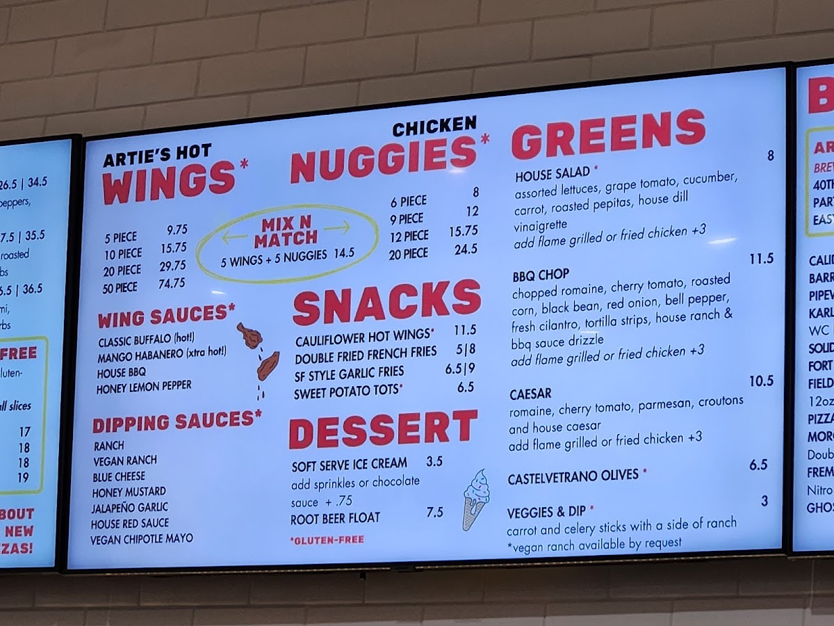 Beyond pizza, the menu rounds itself out with crave-worthy sides and snacks. Greens like BBQ Chop Salad, Caesar Salad, Party Size Caesar Salad, Full House Salad, and Castelvetrano Olives balance the heavier items, while comfort snacks such as Small Fries, Large Fries, SF Style Garlic Fries, Sweet Potato Tots, and vegan favorites like Double Fried French Fries and Cauliflower Hot Wings keep things fun. For heartier bites, Hot Wings 10 Pc, Hot Wings 20 Pc, Hot Wings 50 Pc, Chicken Nuggies 6 Pc, Chicken Nuggies 9 Pc, Chicken Nuggies 12 Pc, and Chicken Nuggies 20 Pc cover everything from casual snacking to party platters. Thoughtful extras like Vegan Ranch, House Red Sauce, Vegan Buffalo Sauce, and drinks such as Headlands Trailblazer Hazy IPA, Kimchi Sour, and Archer Roose Bubbly complete the experience, while a sweet finish with Andre The Giant Chocolate Chip Cookie ties it all together. Overall, the menu feels cohesive, inclusive, and unapologetically fun-a fitting conclusion to a place that knows exactly what it wants to be.